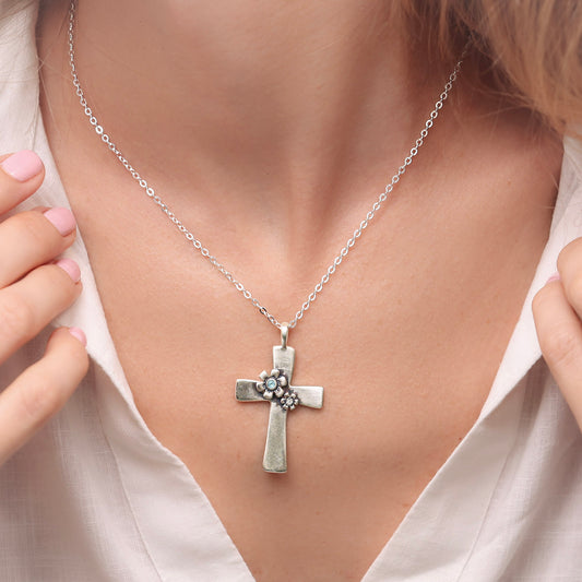 Double Birthstone Bloom Cross Necklace (Sterling Silver)