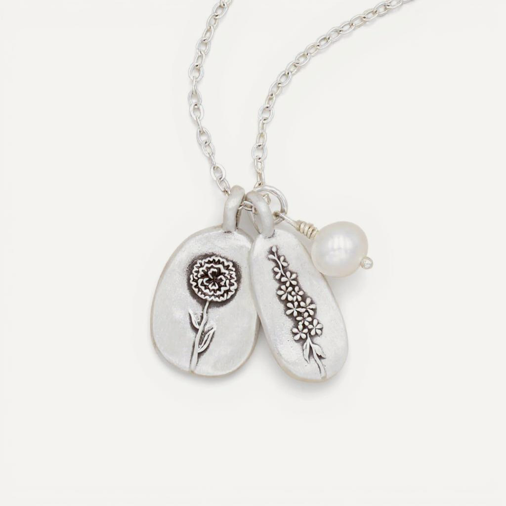 a pewter Better Together necklace, that has 2 love birds and the word "together" engraved on the front Ready to Ship Furry footprint necklace handcrafted in pewter with a paw engraved and personalized with a pet's name Pet Parents Bezel birthstone necklace handcrafted in sterling silver with choice of genuine stone or diamond and personalized with a special name Birthstones Birth Flower word of the year necklace, personalized up to 4 sides and handcrafted in yellow gold My Mantra Essentials Wrapped Around My Heart First Spoon, handcrafted in pewter and personalized with a name or date Kids Accessories Handcrafted sterling silver cross of faith necklace strung on a sterling silver link chain Faith In Memorial