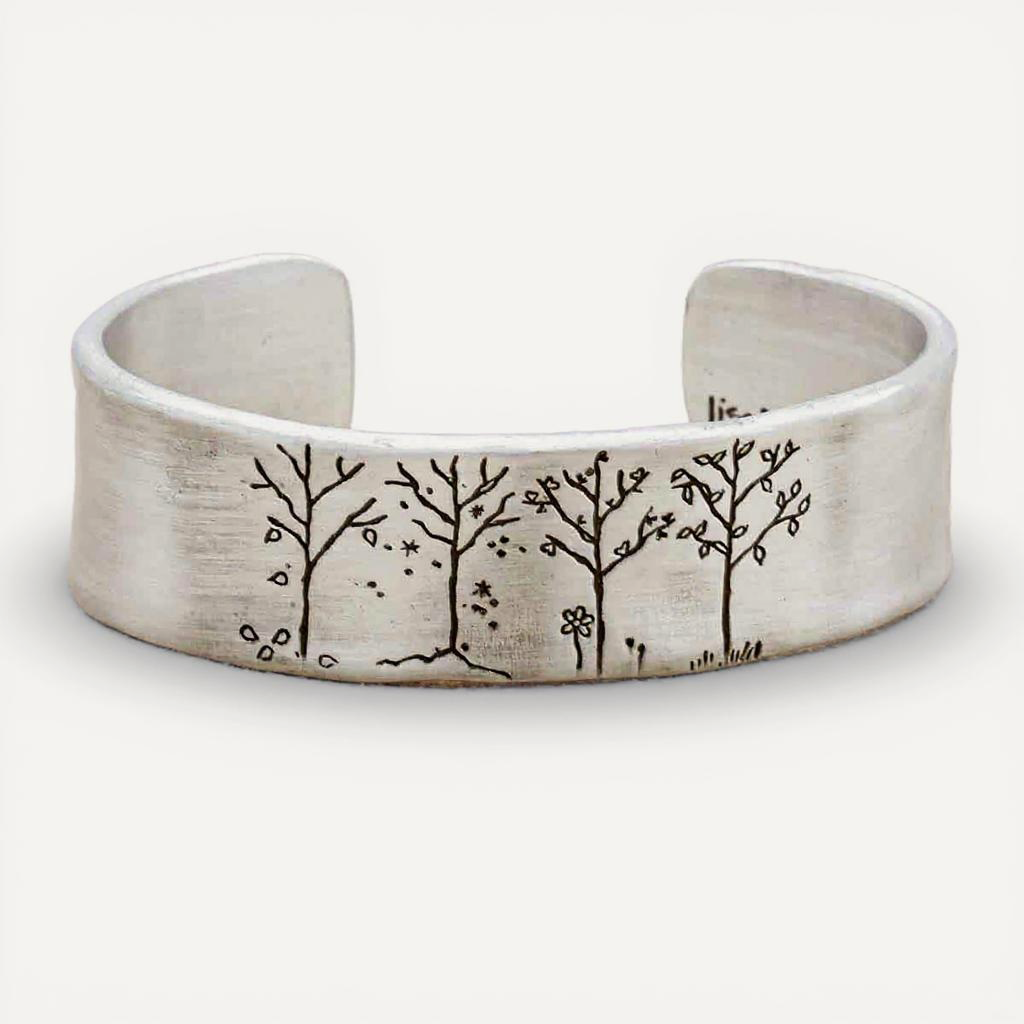 This cuff features hand-carved trees with 'a love for all seasons <3' etched inside. Crafted in pewter, it measures 3/4" tall, 2.5" diameter, with about a 1" opening. Friends we cannot keep these gorgeous, handcrafted cuffs in stock!