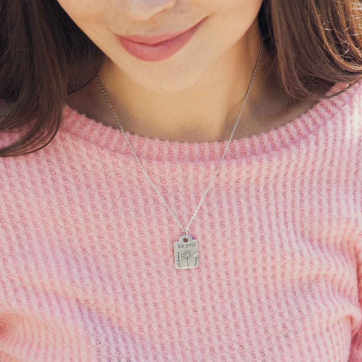 This handcrafted pewter necklace is strung on an 18" silver-toned link chain, measures approximately 1" long x 3/4" wide, and has the words “be you” engraved on the front.