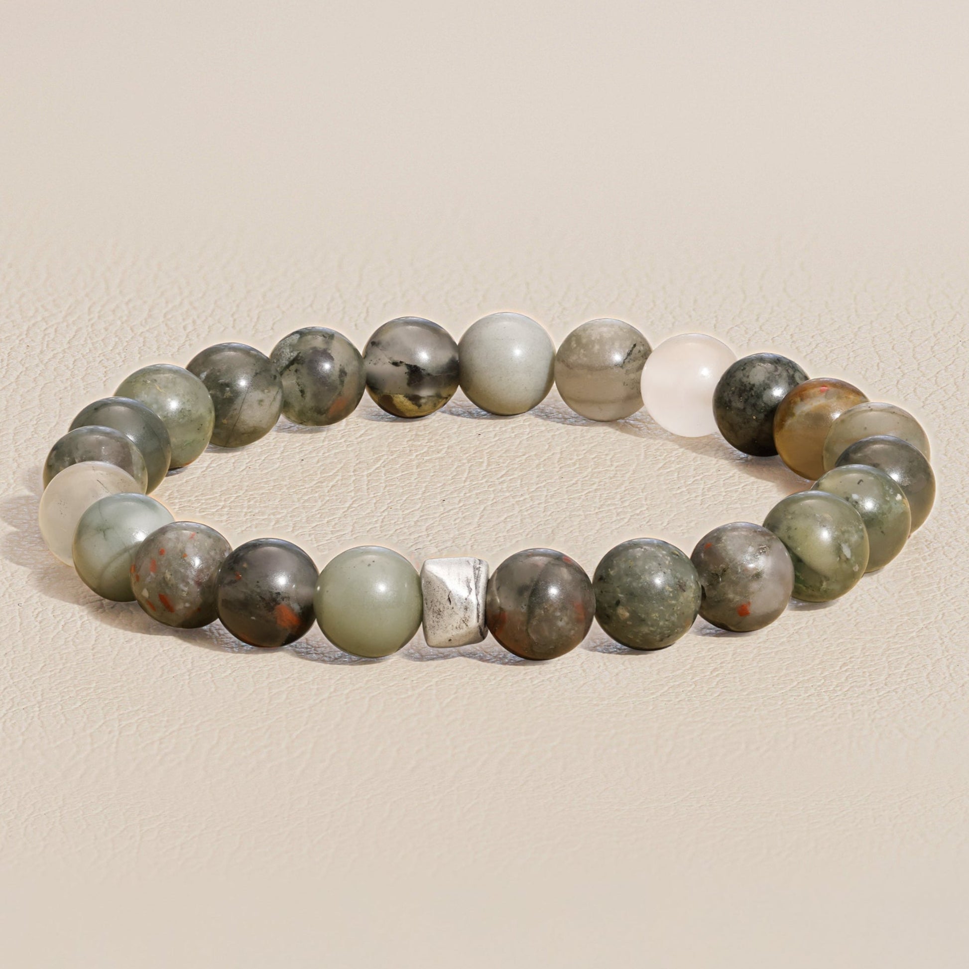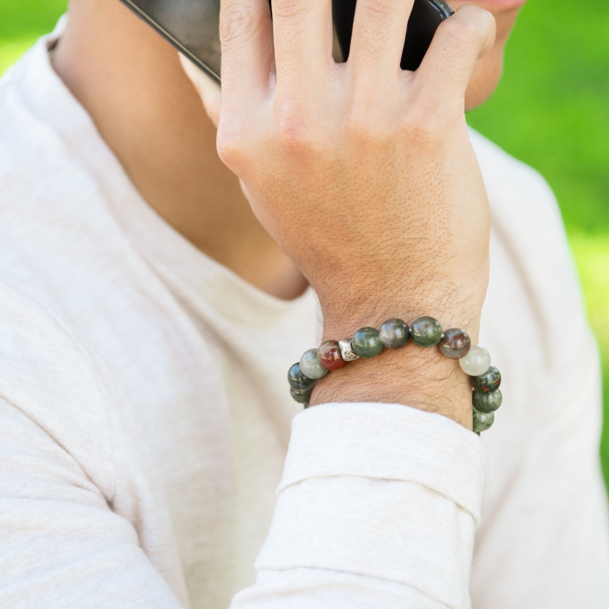 Made with 10mm genuine Blood Stone beads in a glossy finish, this bracelet stretches to fit most sizes. The look is completed with an 8mm antiqued silver tone bead.