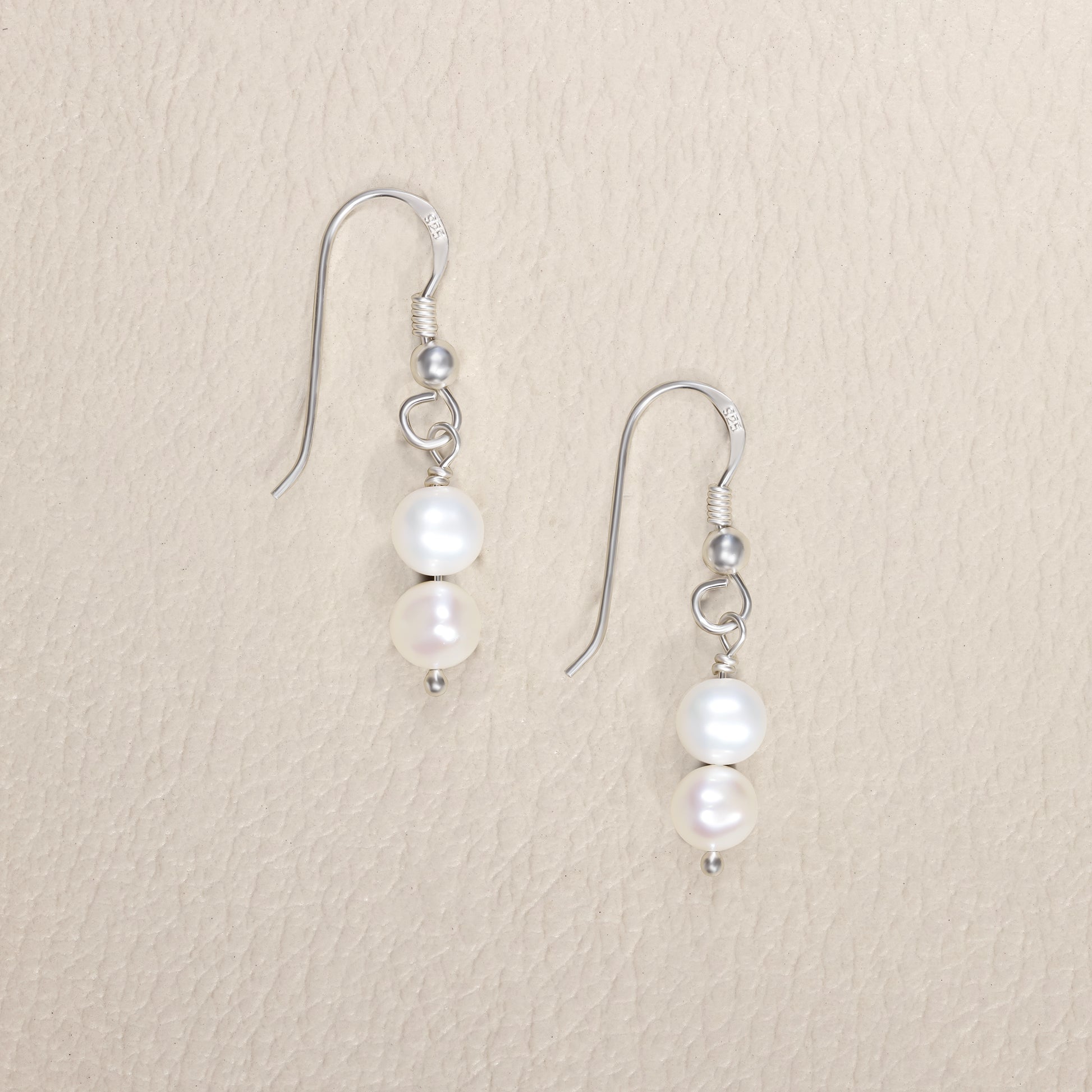 Sterling silver drop earrings set with 2 freshwater pearls, suspended from sterling silver ear wires. Each earring measures approximately 0.75" tall by 0.25" wide.