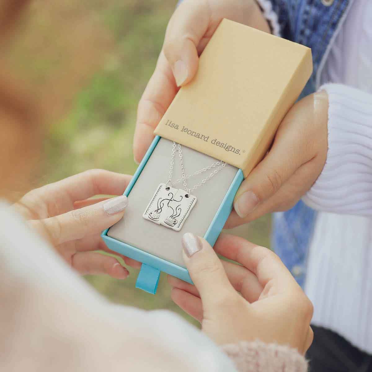 All I want to do is sit with you and share our hearts. There’s a large cup of coffee, prepared just for you, and my favorite tea is steeping in a large mug. With you I can be honest, with me you can be your truest self. This is friendship. The Coffee and Tea Necklace set is meant to be shared. I’ll keep one half and give the other half to a dear one. We’ll wear our necklaces even when we’re apart to keep us close together.