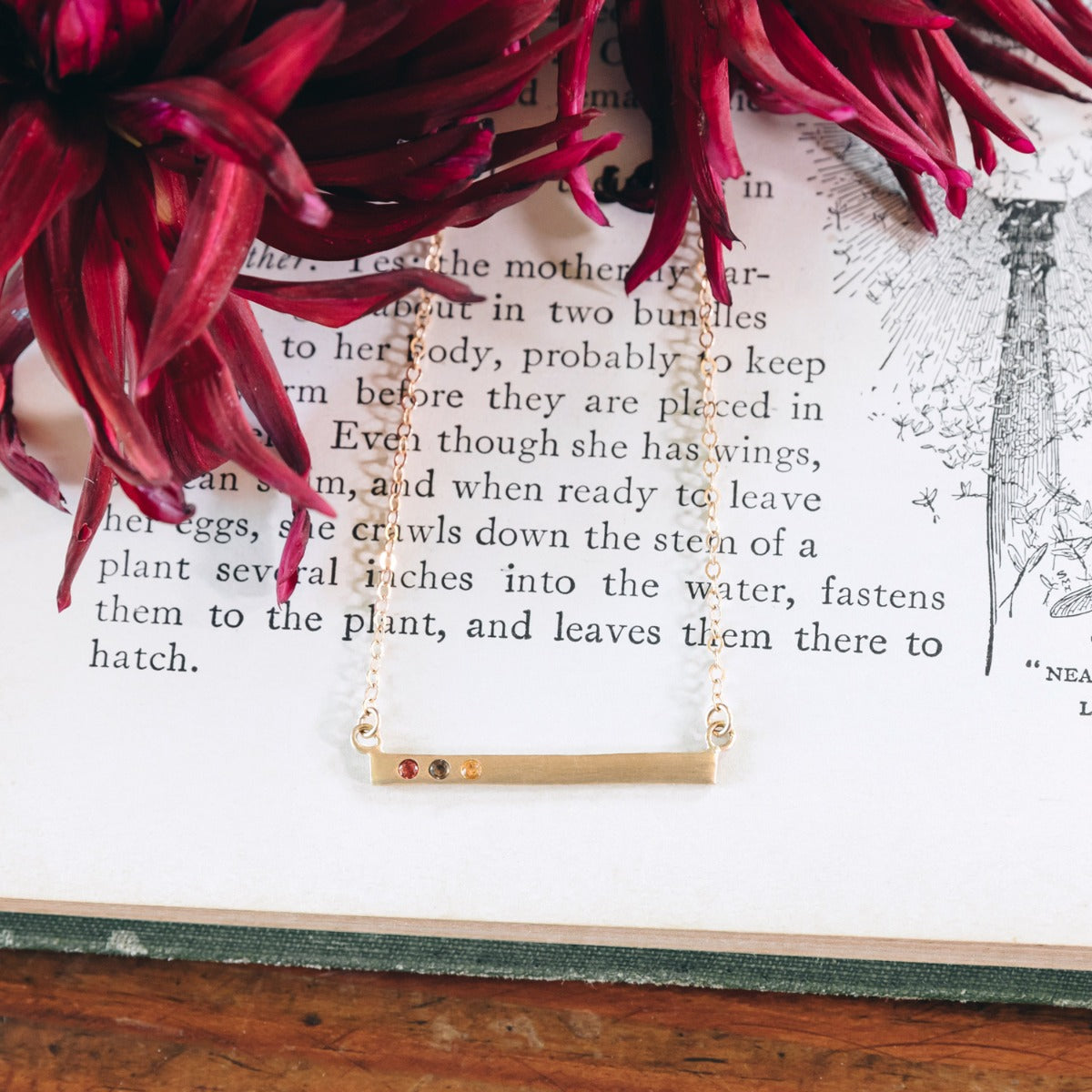 This gorgeous bar necklace is hand-crafted in Sterling Silver with Gold Vermeil and hangs from a gold-filled link chain. Starting price includes three genuine 2mm birthstones. Please note, genuine stones can vary slightly in color and diamonds are a lab grown diamond.
