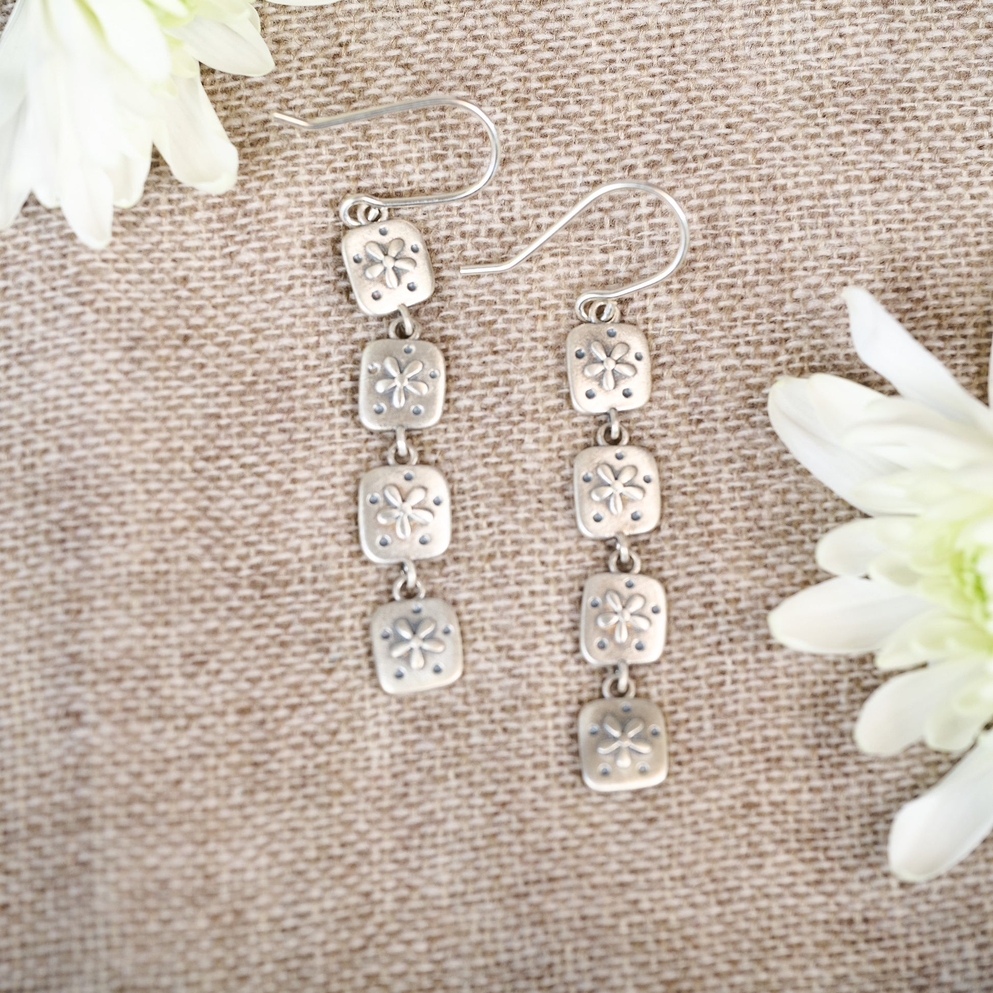 These cute Dainty Wildflowers Drop Earrings are hand-cast in sterling silver. Each wildflower measures approximately 1/4", and you can add up to five wildflowers.
