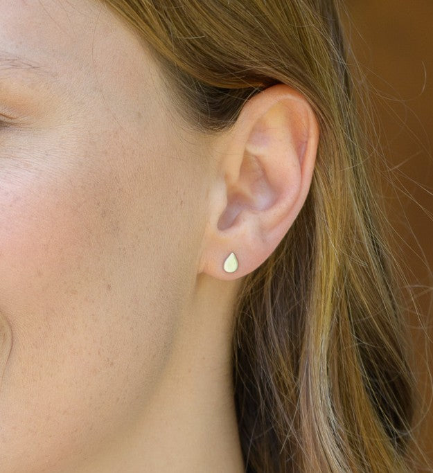 Sterling silver raindrop studs with a matte brushed finish, each under 1/4" tall with 9mm posts.