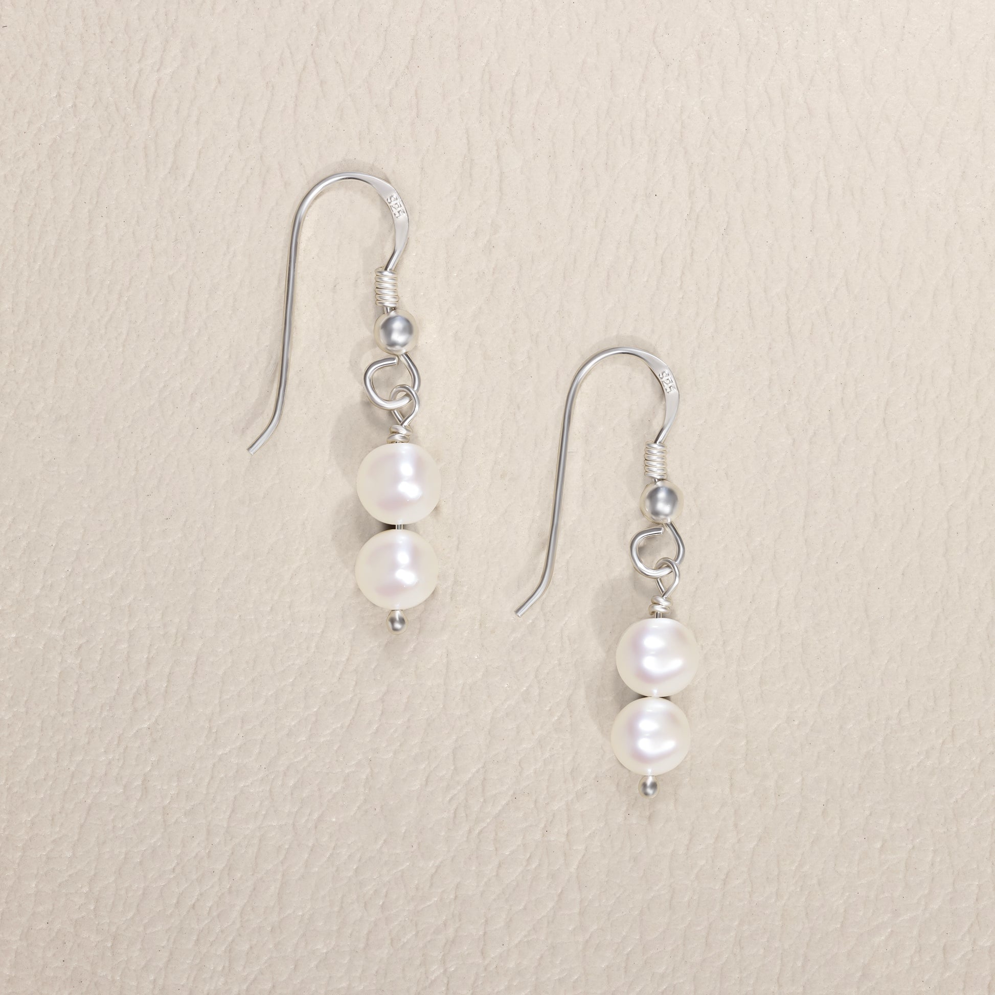 This beautiful pair of earrings is handcrafted in sterling silver with 2 freshwater pearls, and hang from sterling silver ear wires. Each earring measuring just under 3/4" tall and 1/4" wide.