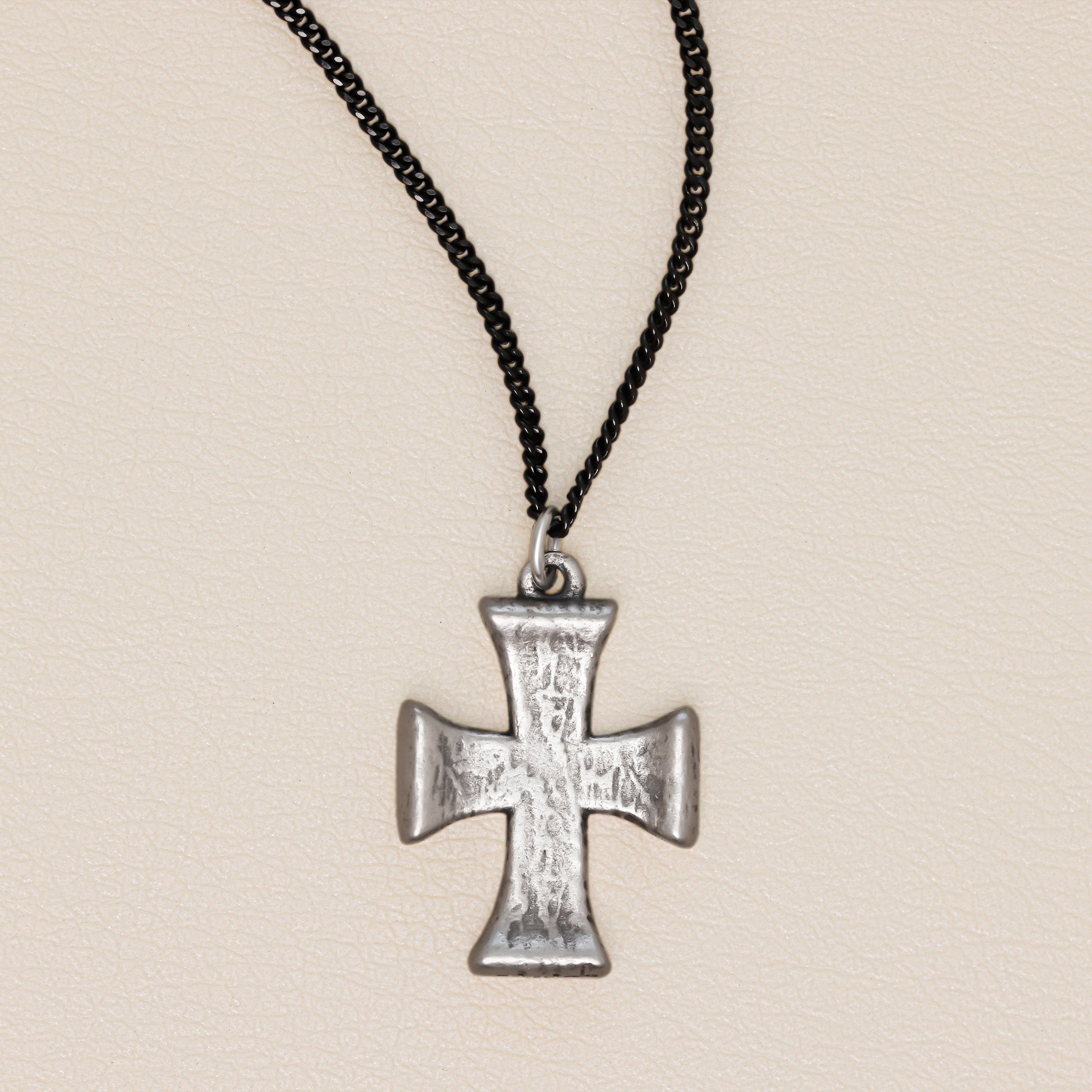 This cross necklace is handcrafted in textured antiqued sterling silver with the pendant strung on matte gunmetal-plated sterling curb chain. The cross measures approximately 1" tall and 3/4" wide.