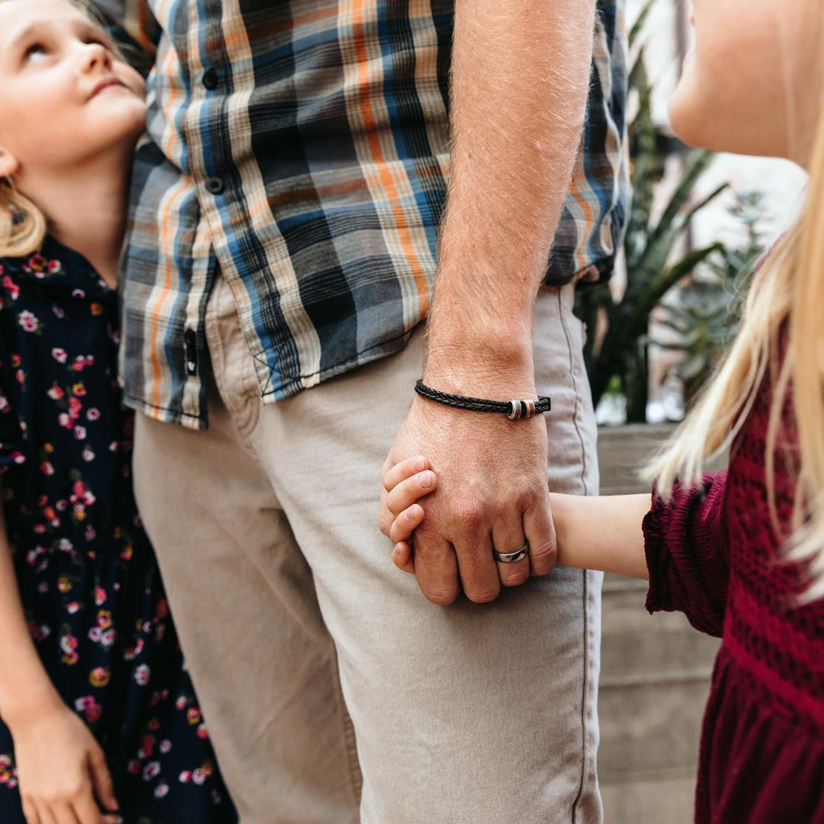 This bracelet is handcrafted with a dual black bolo leather cord and blackened-sterling hook closure. Measurements include 3mm wide cords with 1/2" by 1/2" bead and a total length of 8" for standard size and 9" for extra large. The bracelet includes 2 distressed ring charms - 1 sterling silver, 1 brass.