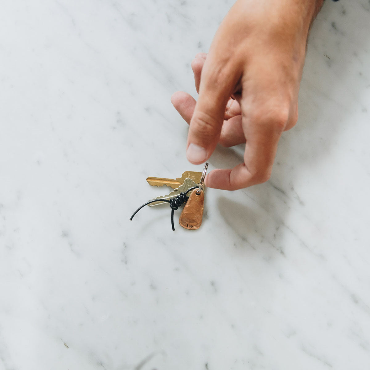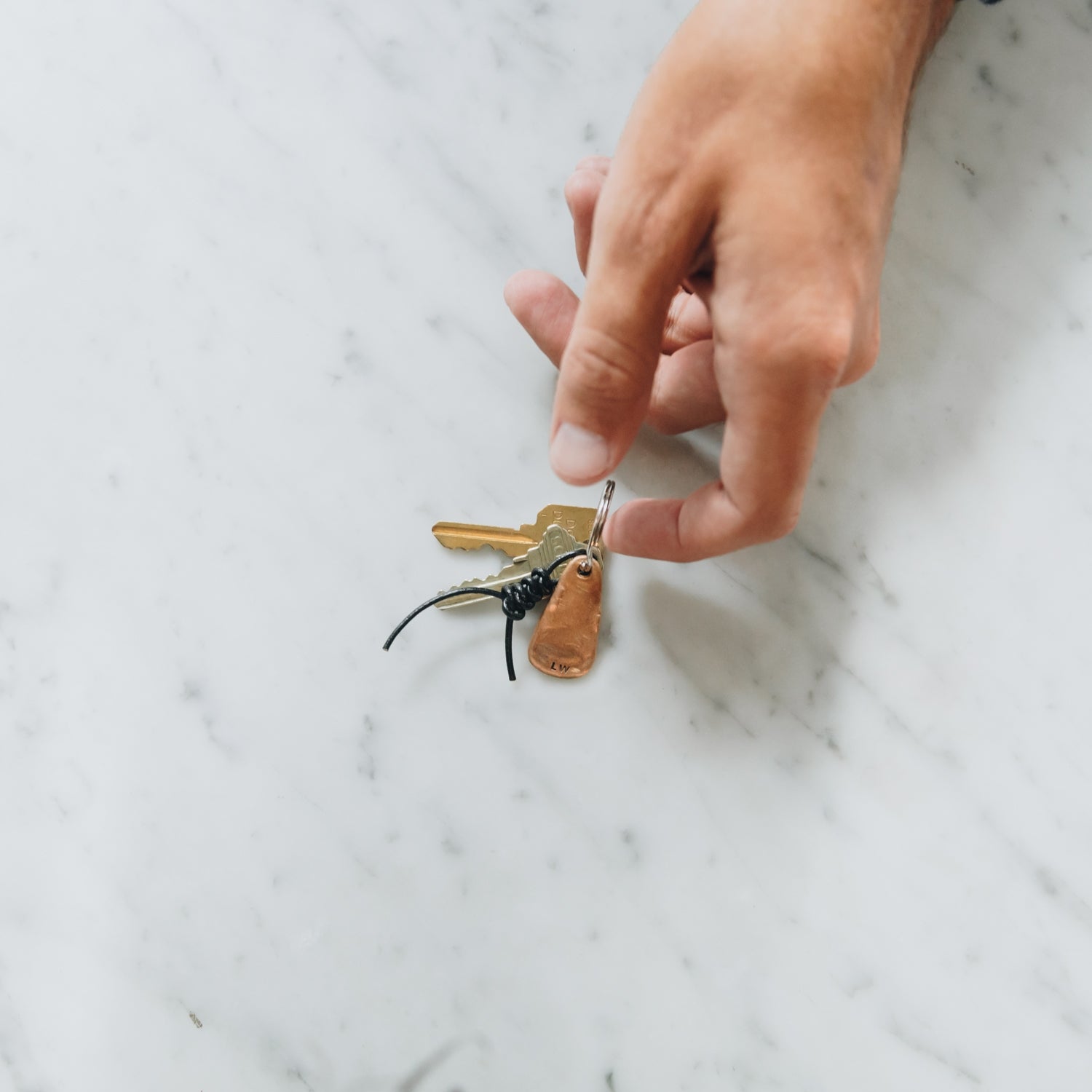 Tag made of hand cast bronze and hammered for artisan feel. This meaningful key ring is handcrafted in bronze and measures 1 1/2" tall by 5/6" wide with a 1 1/4" ring. Customize yours with up to 4 hand-stamped characters, uppercase only.