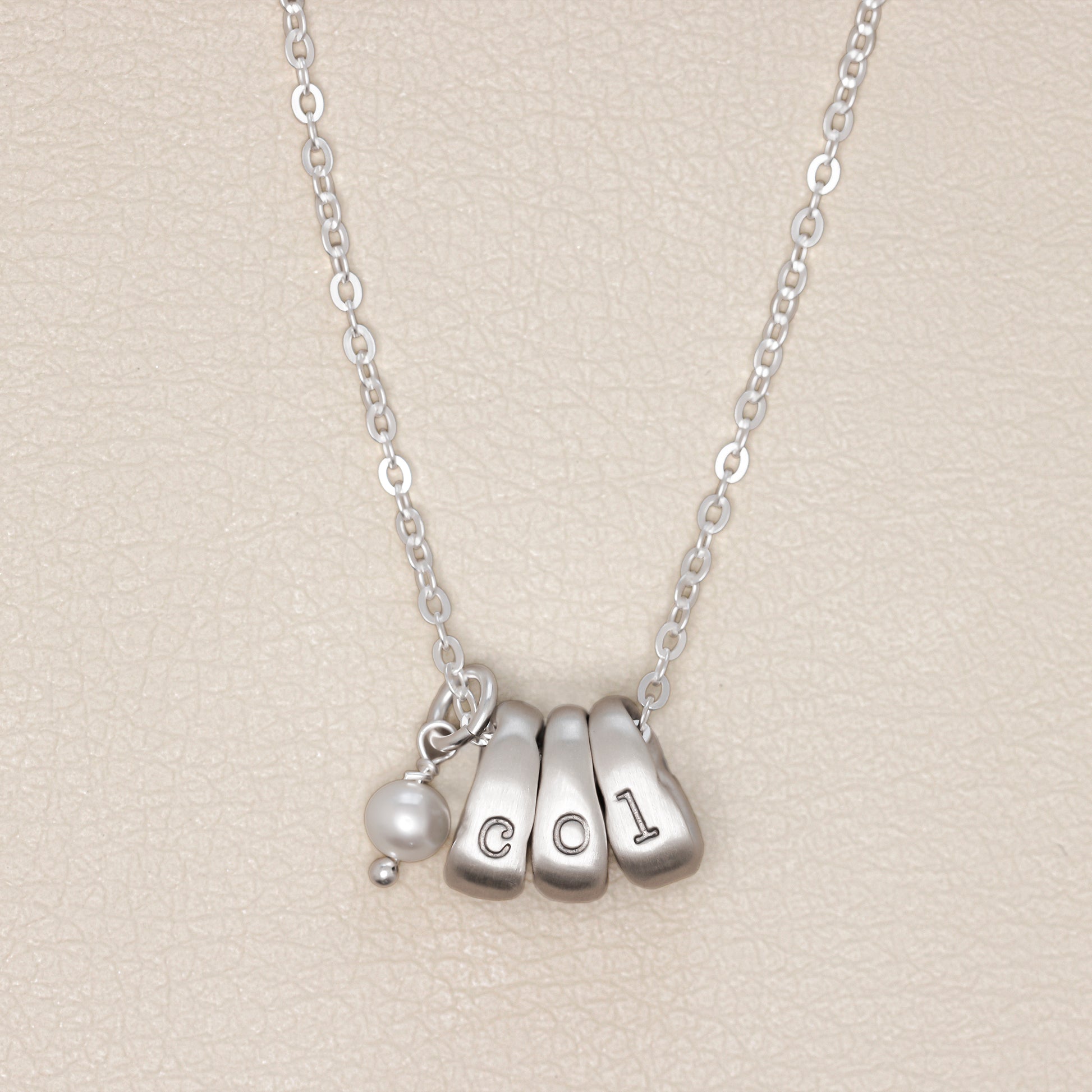 This sweet Itty Bitty Initial Ring Charms Necklace is cast in sterling silver, comes with your choice of 1-5 charms, each stamped with 1 note, and a 4mm freshwater pearl. The charms measure approximately 1/2" tall, and are hangs from a sterling silver link chain. As an intentional design decision, we stamp in lowercase letters only. To specify a heart, please enter <3.