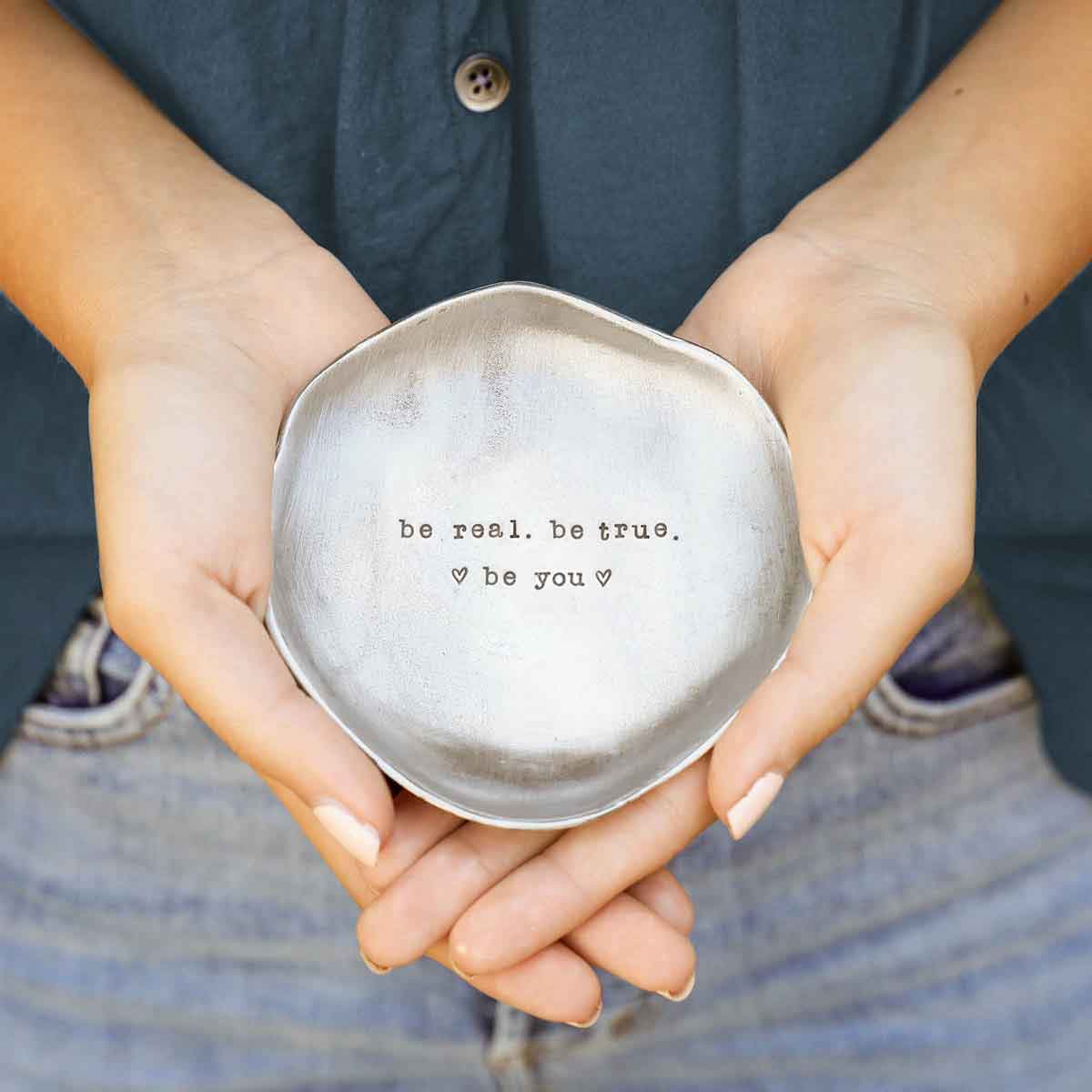 A sweet treasure that will warm your heart for years, the keepsake dish is hand-formed and cast in pewter for a soft, organic feel. Customize the bowl with special names, a phrase, and date—up to four lines! What a gorgeous gift for yourself or a friend! Your custom piece will be made just for you, exactly as you type it into the field. For dots between names, please use a period.