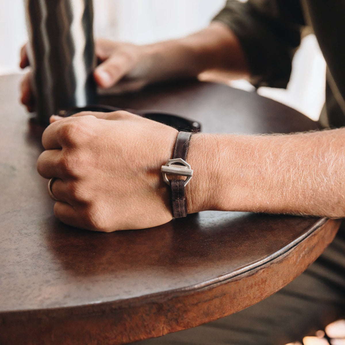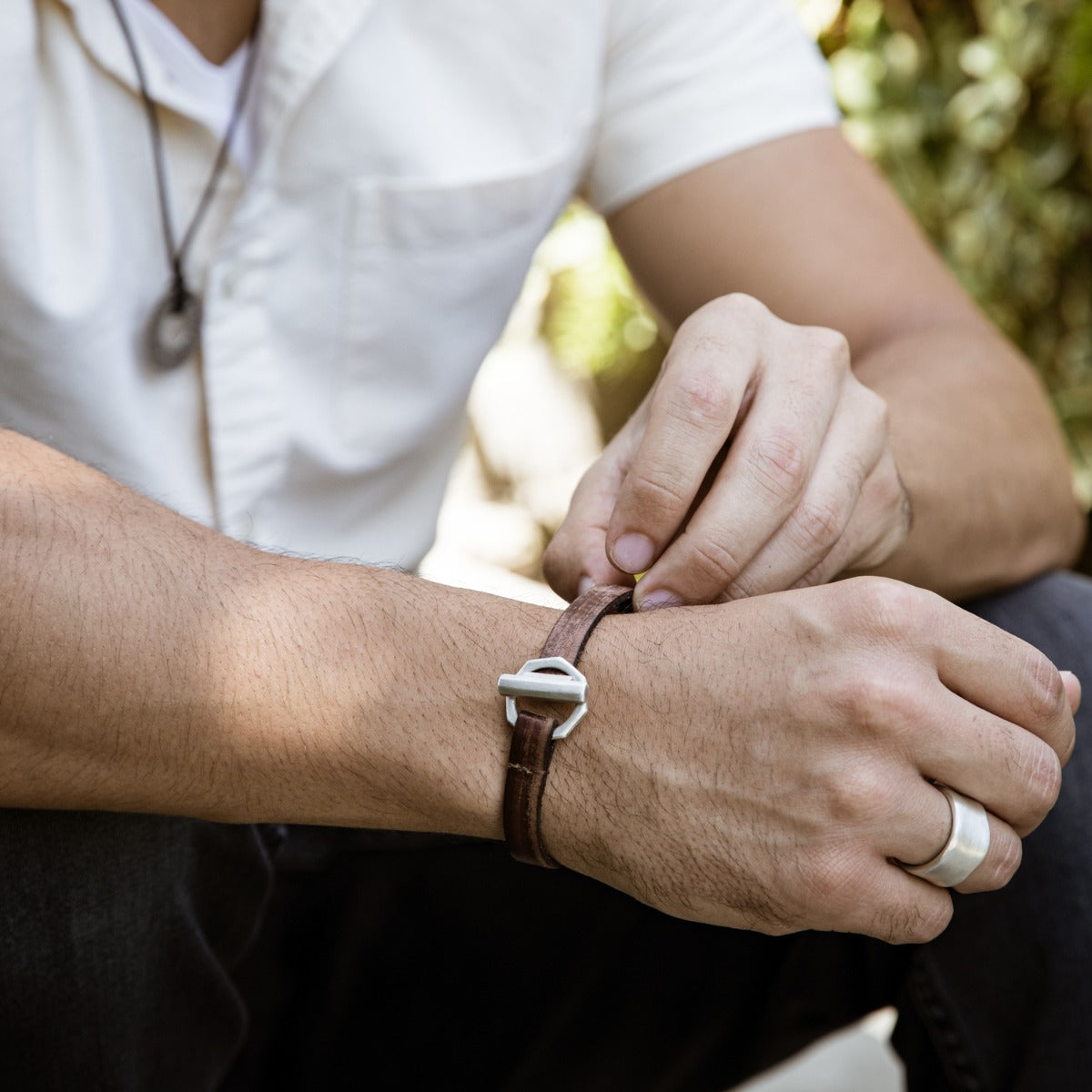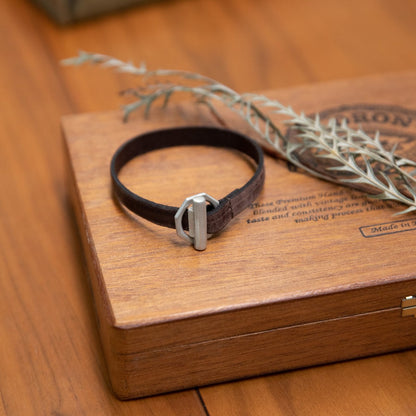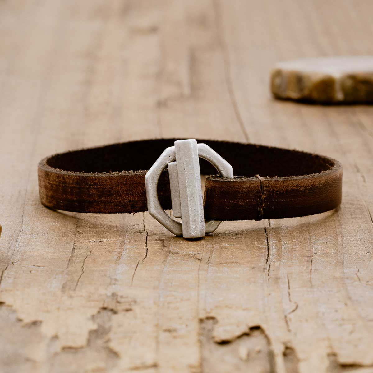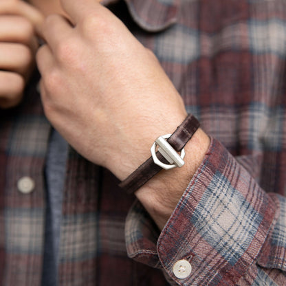 This bracelet is handcrafted in water buffalo brown leather with a sterling silver toggle closure. It measures 10mm wide with total length being 8" for standard size 9" for extra large.
