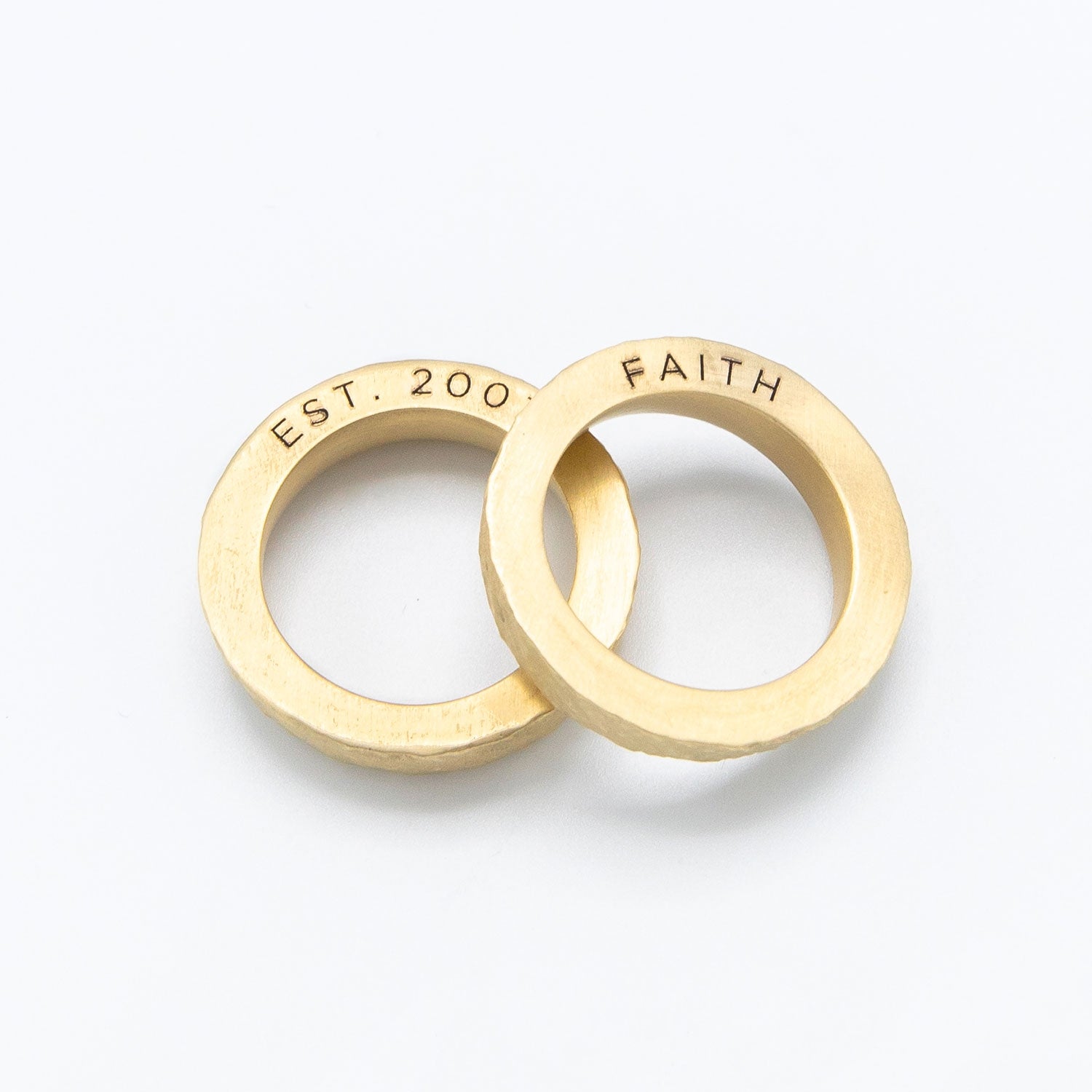Handcrafted in 14k yellow gold with a textured finish, each band ring measures just over 1/4", with both rings stacked together being 1/2" tall, and fits true to size. Customize yours with a meaningful name, word, or date up to 10 characters long, uppercase only.