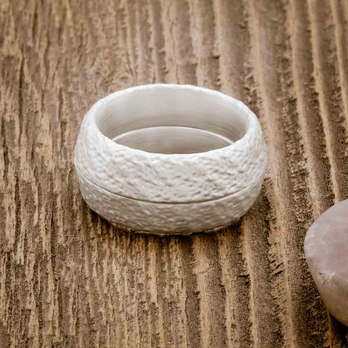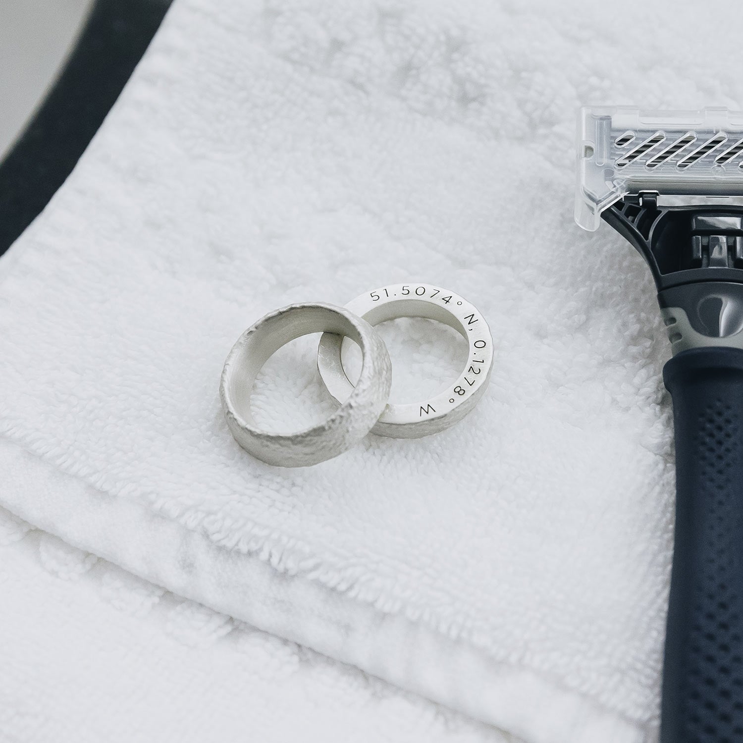 Handcrafted in sterling silver with a textured finish, each band ring measures just over 1/4", with both rings stacked together being 1/2" tall, and fits true to size. Customize yours with a meaningful name, word, or date up to 10 characters long, uppercase only.