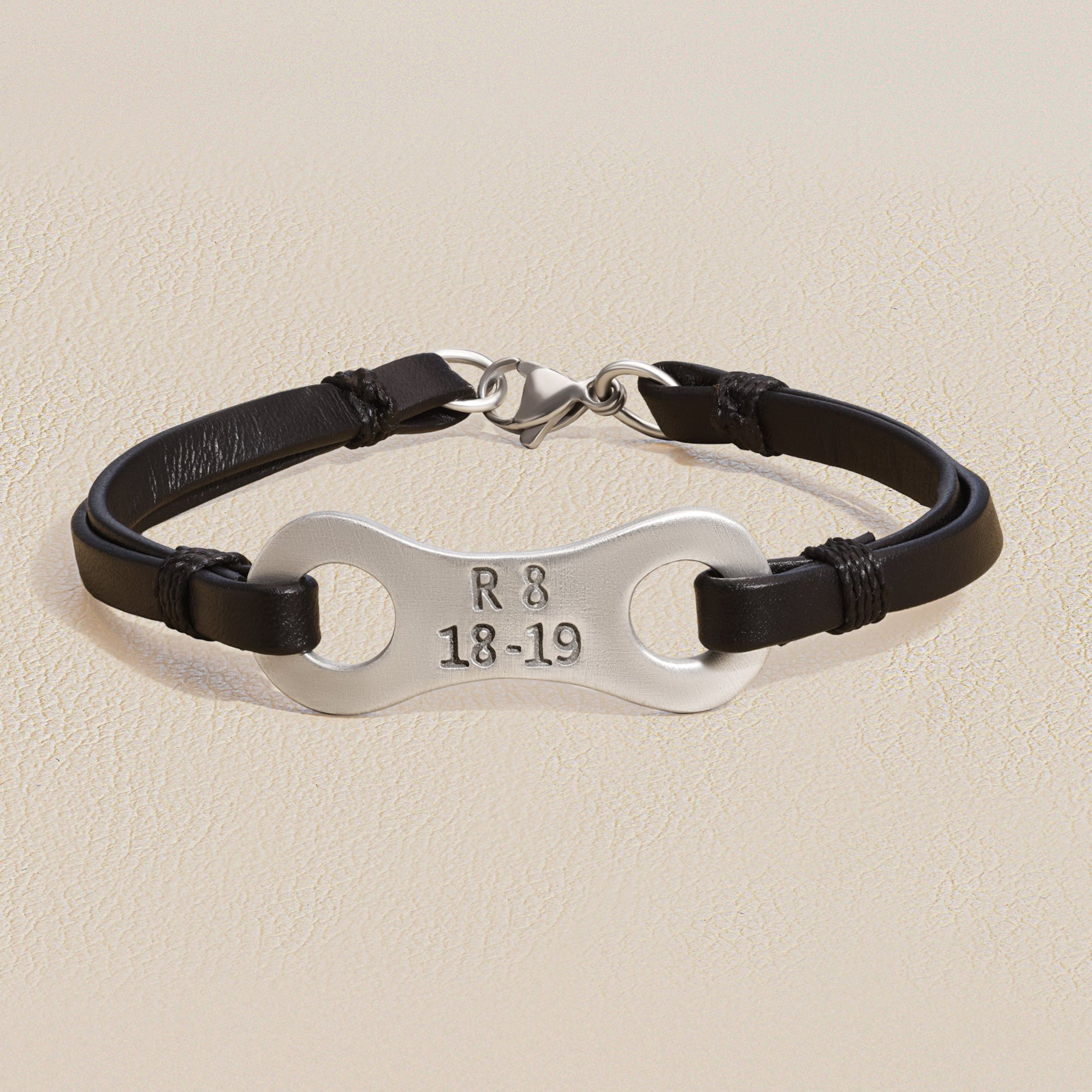 This bracelet is handcrafted in black latigo leather with a pewter link and lobster clasp closure. The link is engraved with "R 8 18-19" and measures approximately 1 1/2" with the standard size measuring 8" and the extra large 9".