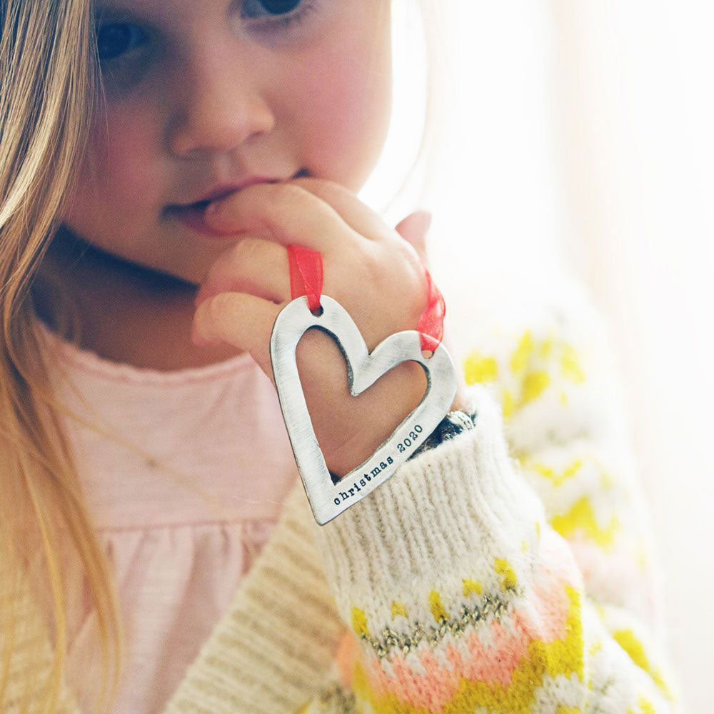 This pewter heart measures 2" tall x 2" wide and hangs from a sheer red ribbon. As an intentional design decision, we stamp in lowercase letters only. To specify a heart, please enter <3 into the customization field.