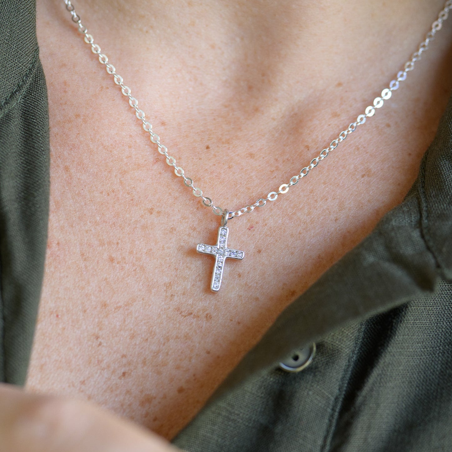 This genuine lab-grown diamonds cross necklace holds deep meaning and is absolutely stunning. The Passage Cross Necklace is cast in sterling silver and set with 0.2ct lab-grown diamonds. The pendant measures 0.6" high and hangs from a sterling silver link chain.