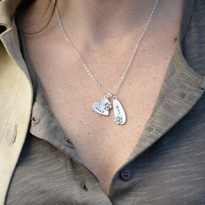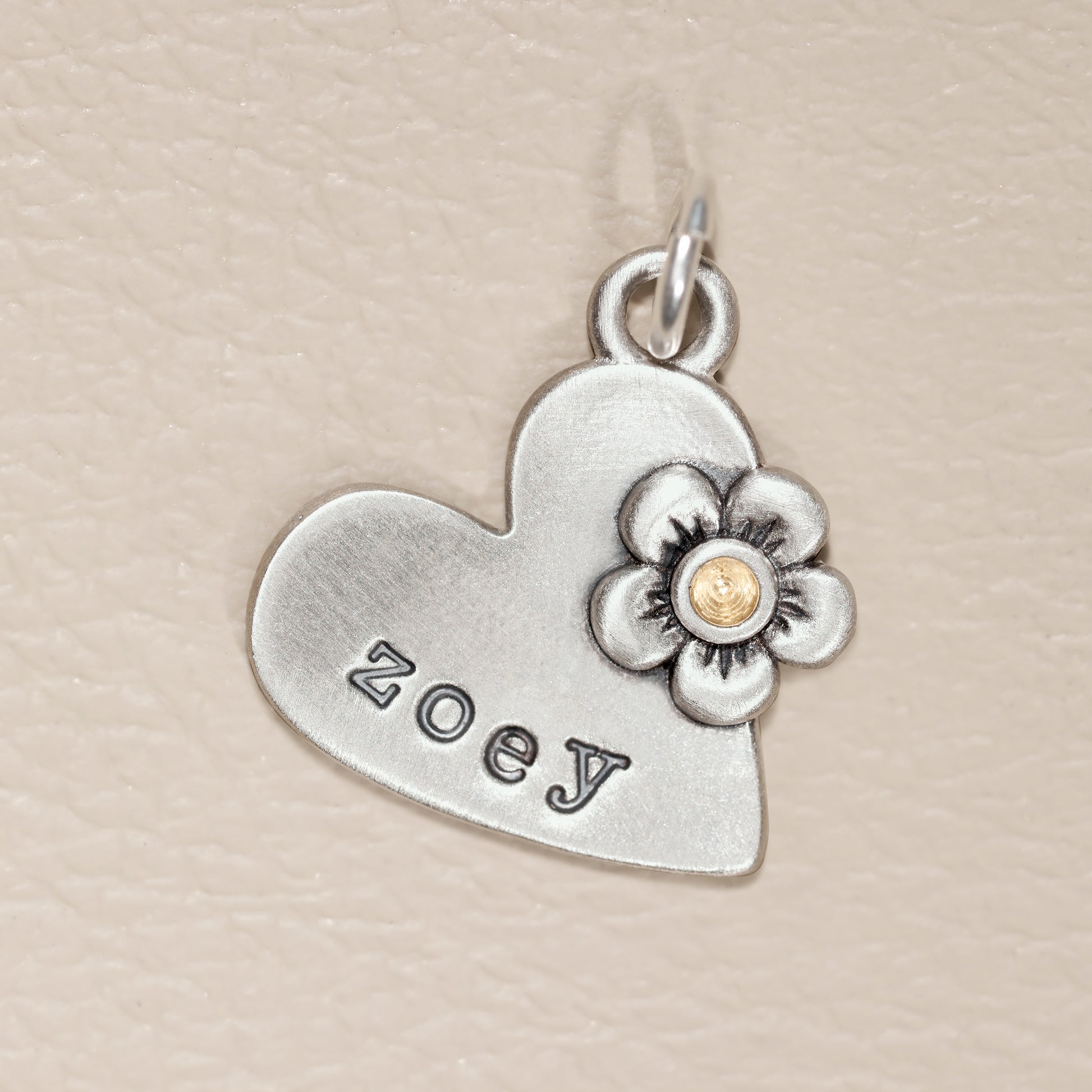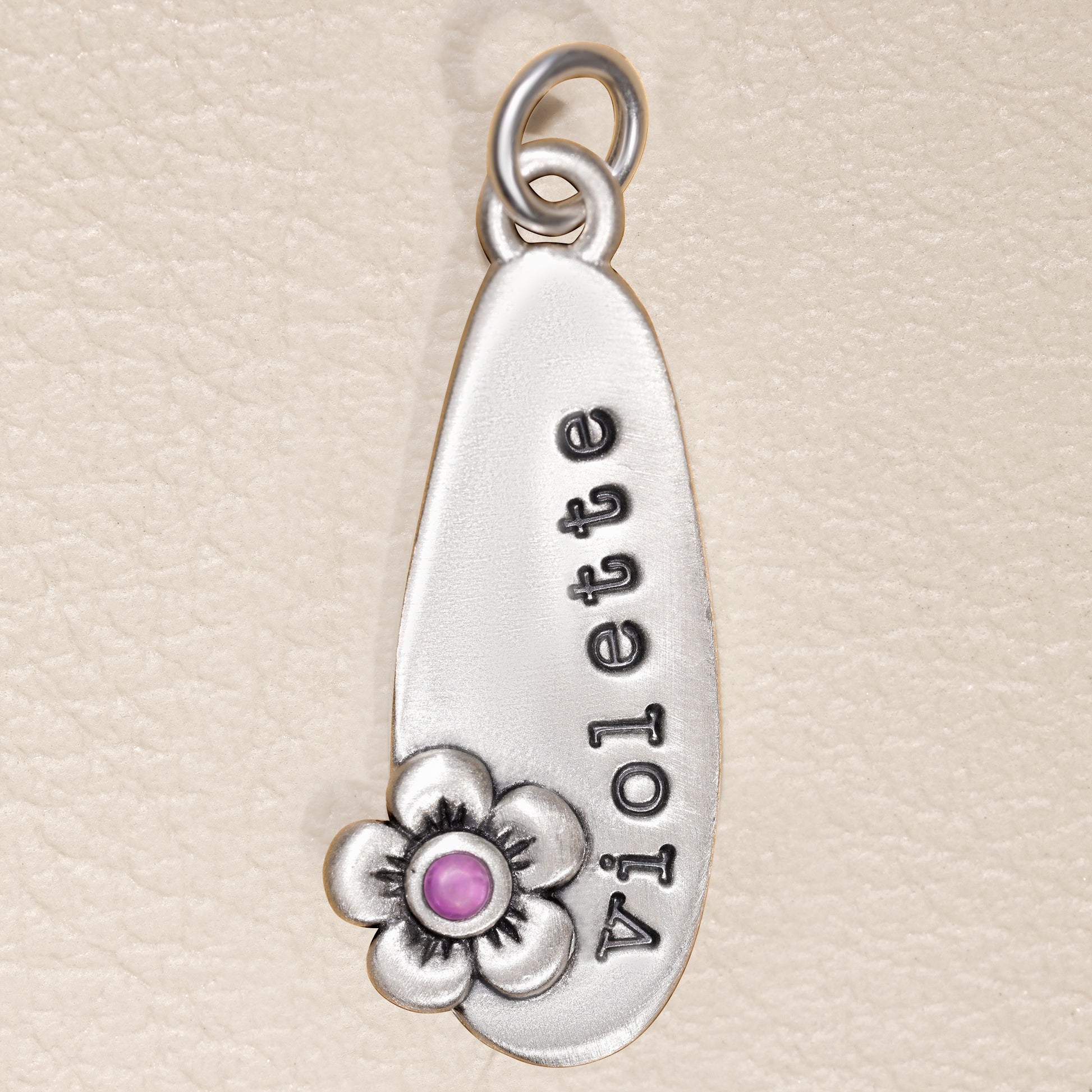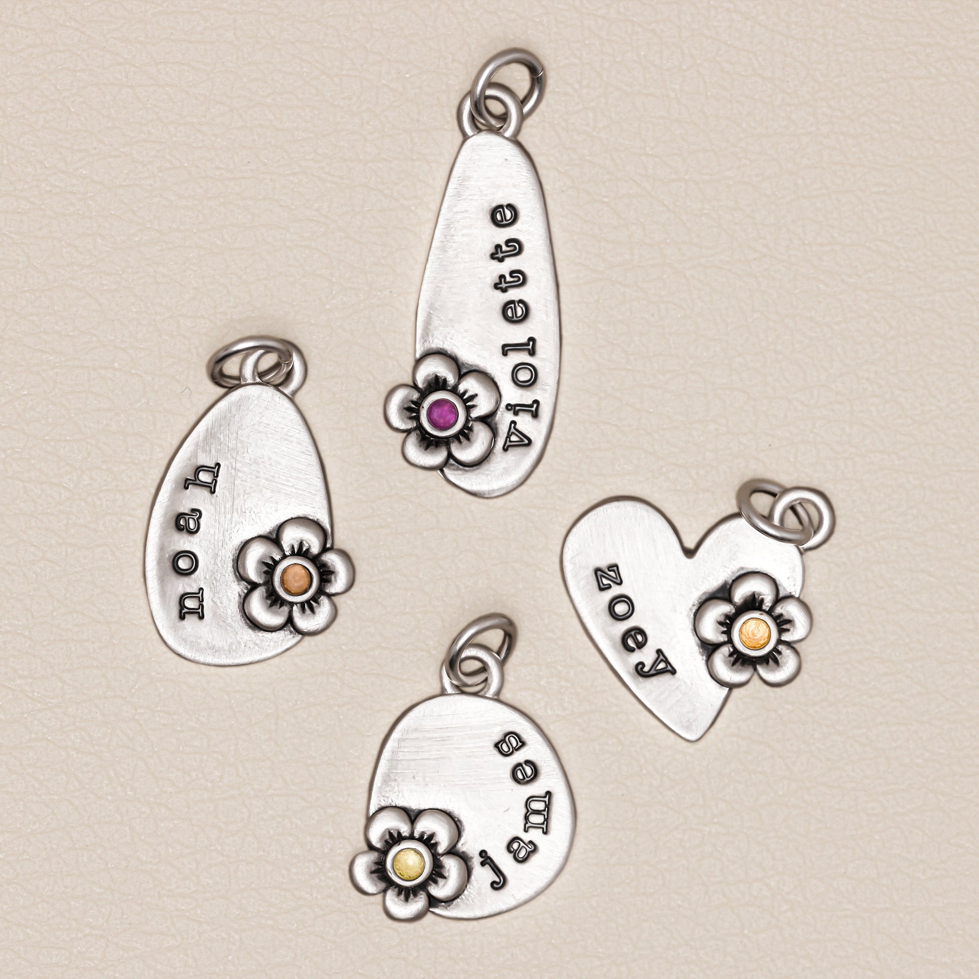 The sterling silver charm is finished with a birthstone set inside a sterling silver flower bezel. Choose from 4 types of charms: oval charm, long drop charm, round charm, and heart charm. Charms measure approximately 1/2" wide and 3/4" long, and hang from a sterling silver link chain. As an intentional design decision, we stamp in lowercase letters only. To specify a heart, please enter <3 in the customization field.
