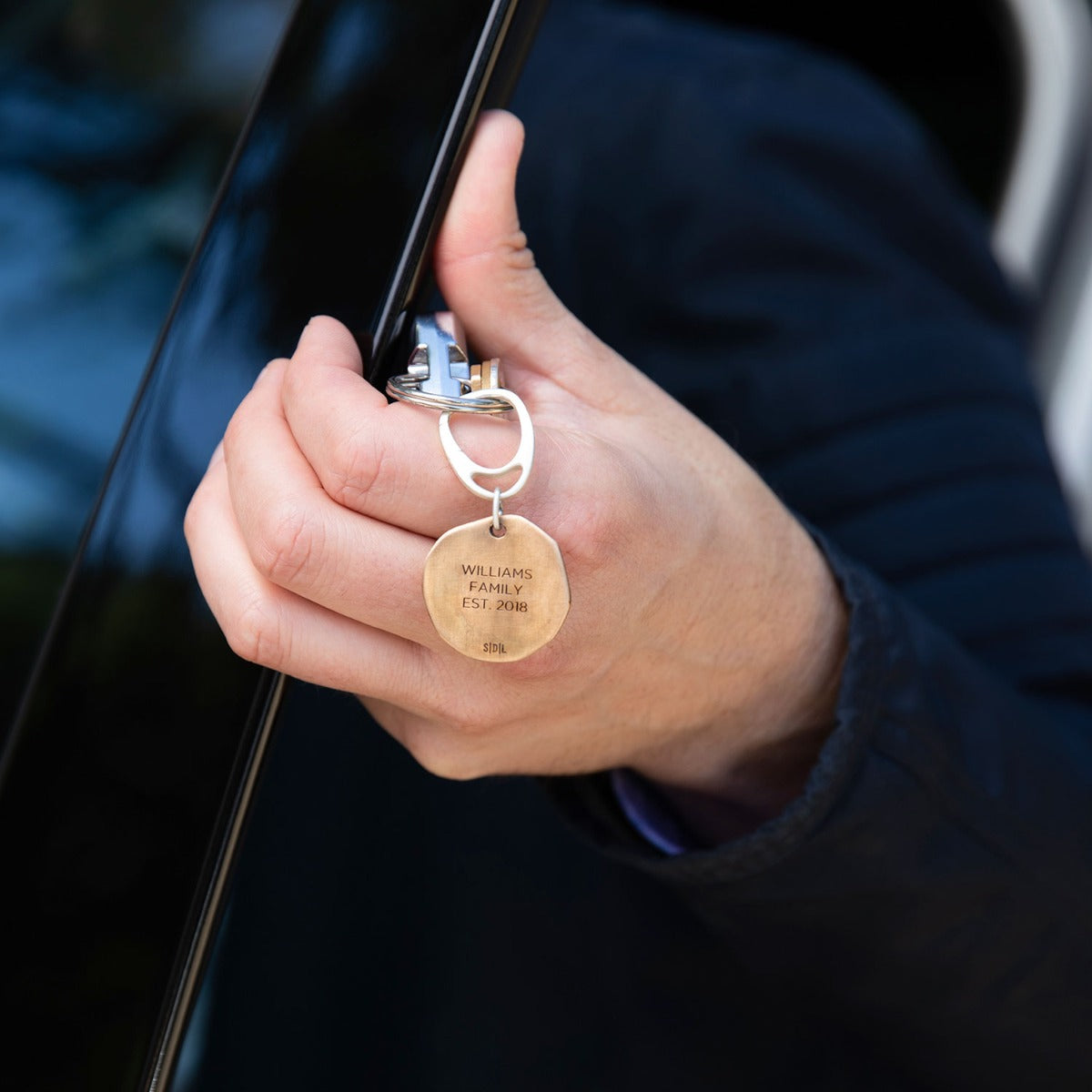 This meaningful key ring features a brass coin with a raised cross, along with a clasp. The coin measures approximately 1 1/4" tall and 1 1/4" wide.