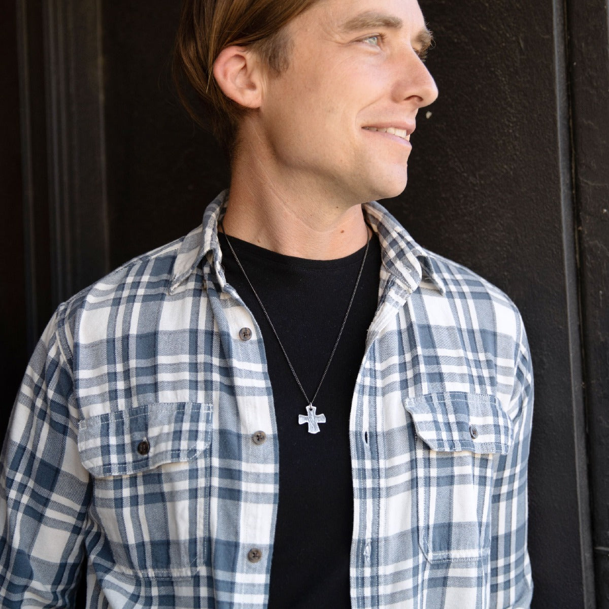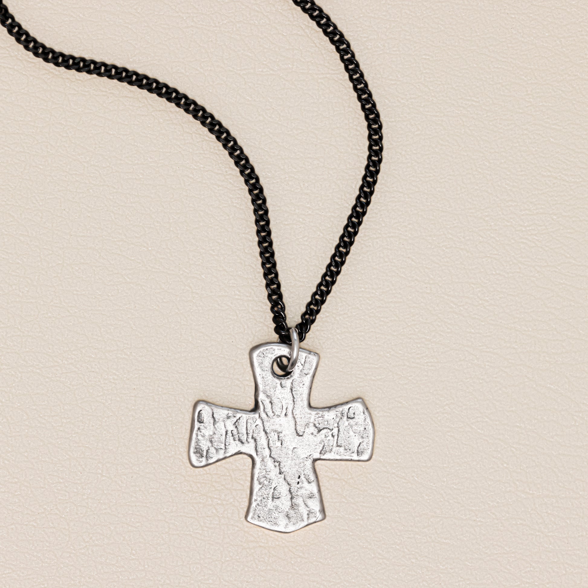 This cross necklace is handcrafted in textured, antiqued sterling silver with the pendant strung on your choice of chain. The cross measures approximately 1" tall and 1" wide.