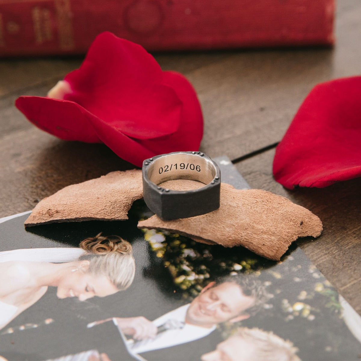 Handcrafted in sterling silver, this ring is sandblasted to a hammered, matte black finish, which looks better with age. The band measures at 1/3" tall with two small rivets handcarved into each corner and fits true to size. Customize your ring with a meaningful name, word, or date up to 10 characters long, uppercase only.