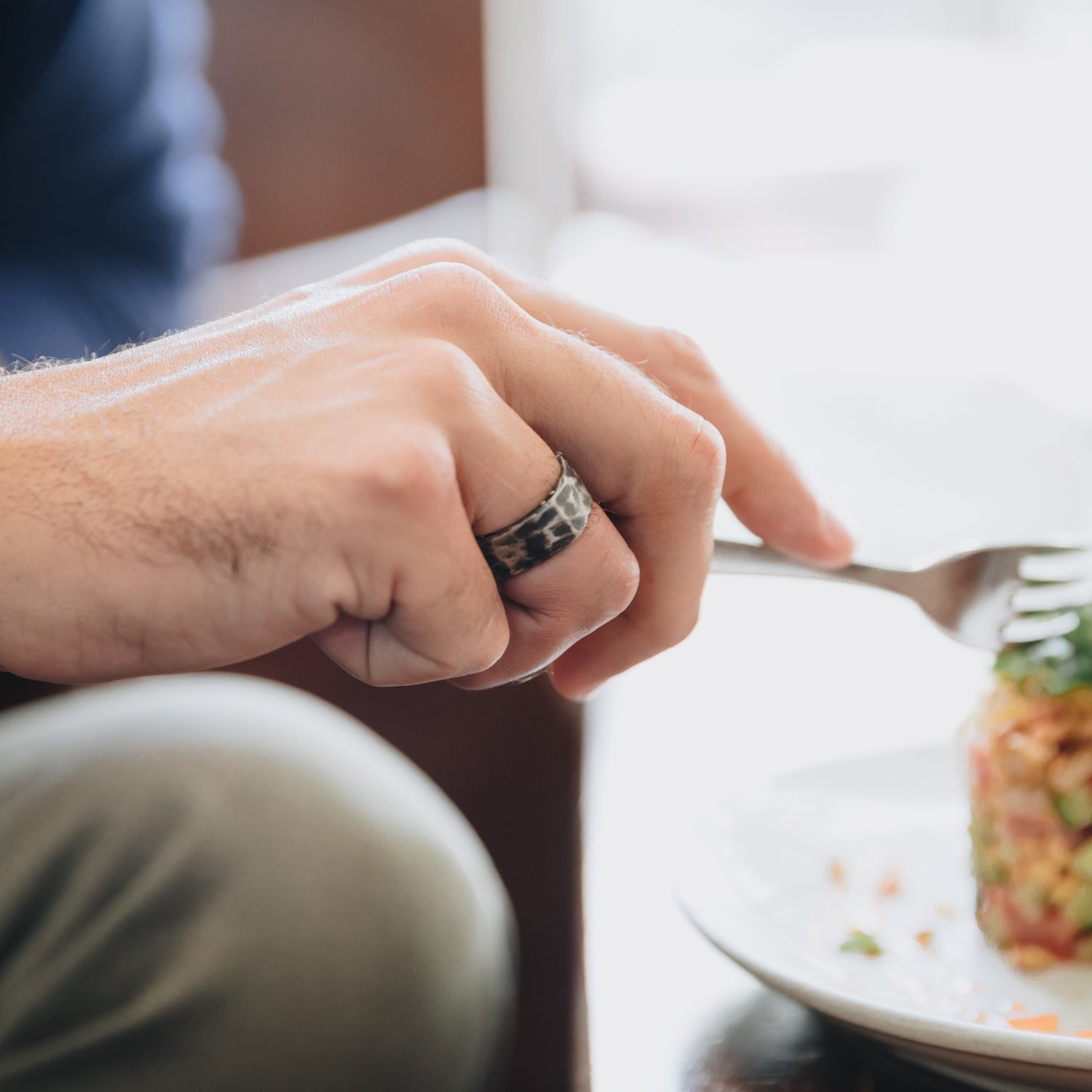 Handcrafted in sterling silver, this ring is hammered to an antiqued finish, which looks better with age. The band measures at 1/3" tall with two small rivets handcarved into each corner and fits true to size. Customize your ring with a meaningful name, word, or date up to 10 characters long, uppercase only.