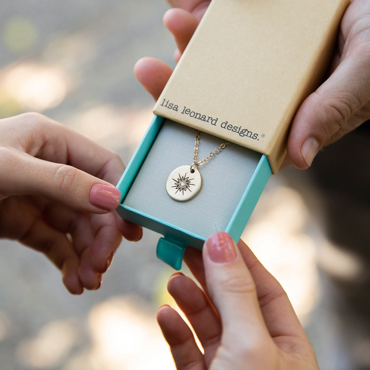 Do you know that feeling; when you're walking through a dark time and you're wondering if hope or joy are even possible? Your heart is grieving. And then you feel it--just a hint of light. The smallest ray of hope. And you hold onto it as tightly as you can. The sunburst necklace captures that glimmer of hope. Truly a stunning piece!