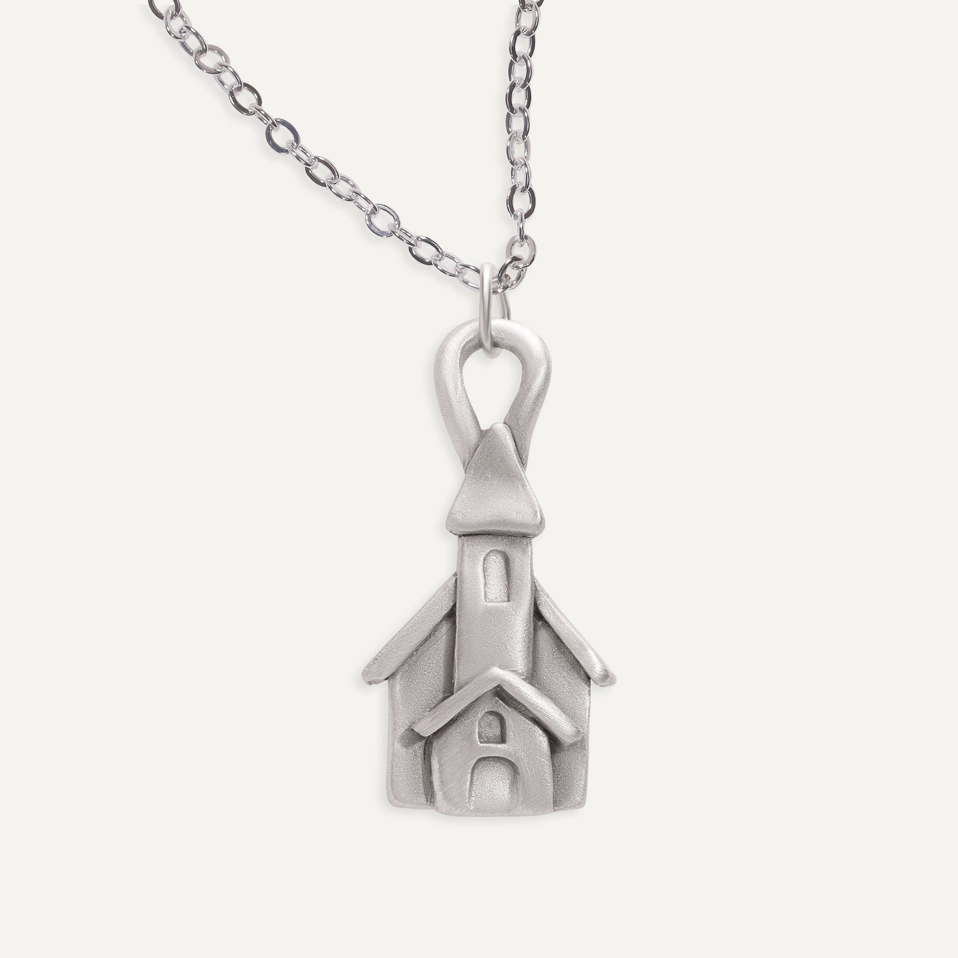 This sweet necklace is hand-molded and cast in fine pewter. It measures approximately 1" tall, and hangs from an 18" stainless steel chain.