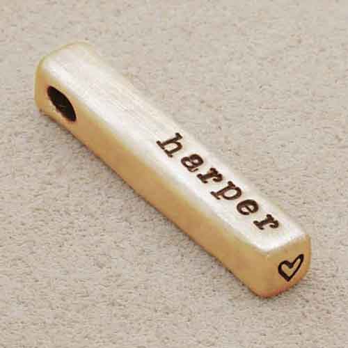 Charm is hand-molded in 14k yellow gold and measures 1 1/4" tall x 1/4" wide. As an intentional design decision, we stamp in lowercase letters only. To specify a heart, please enter <3 into the customization field.