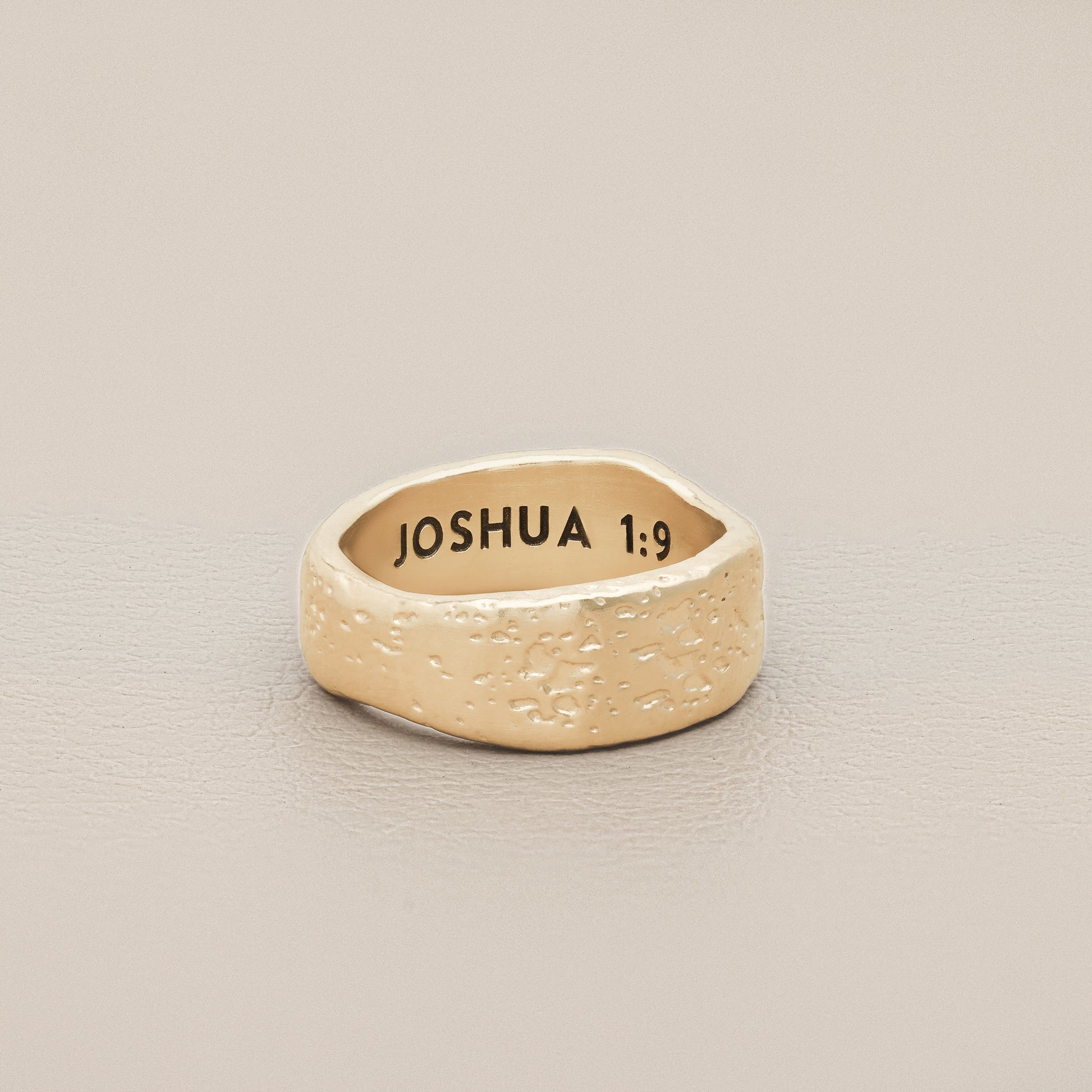 A 10mm Ring for those who prefer a wider profile. Handcrafted in 10k yellow gold with a textured finish, this band measures at 10mm tall and fits true to size. Customize your ring with a meaningful name, word, or date up to 10 characters long, uppercase only.