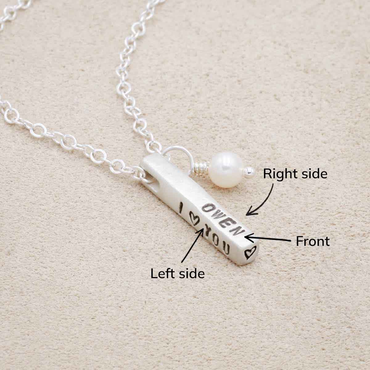 This adorable tiny charm is hand-molded in sterling silver and measures approximately 3/4" tall x 1/8" wide. It is engraved with a tiny heart on the bottom, hangs from a sterling silver link chain and includes a freshwater pearl. To specify a heart, please enter <3 into the customization field.
